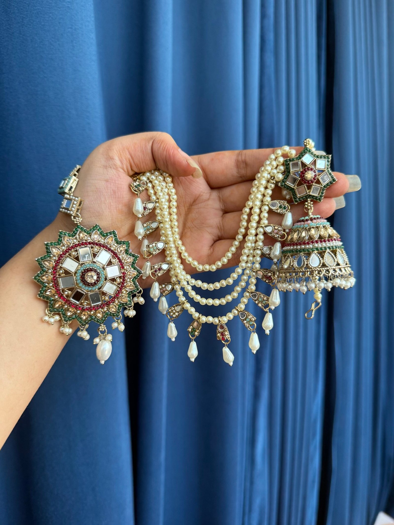 Be the first to review “Maharani Kundan Earrings with Kaan Chain and Mangtika – Multi” Cancel reply