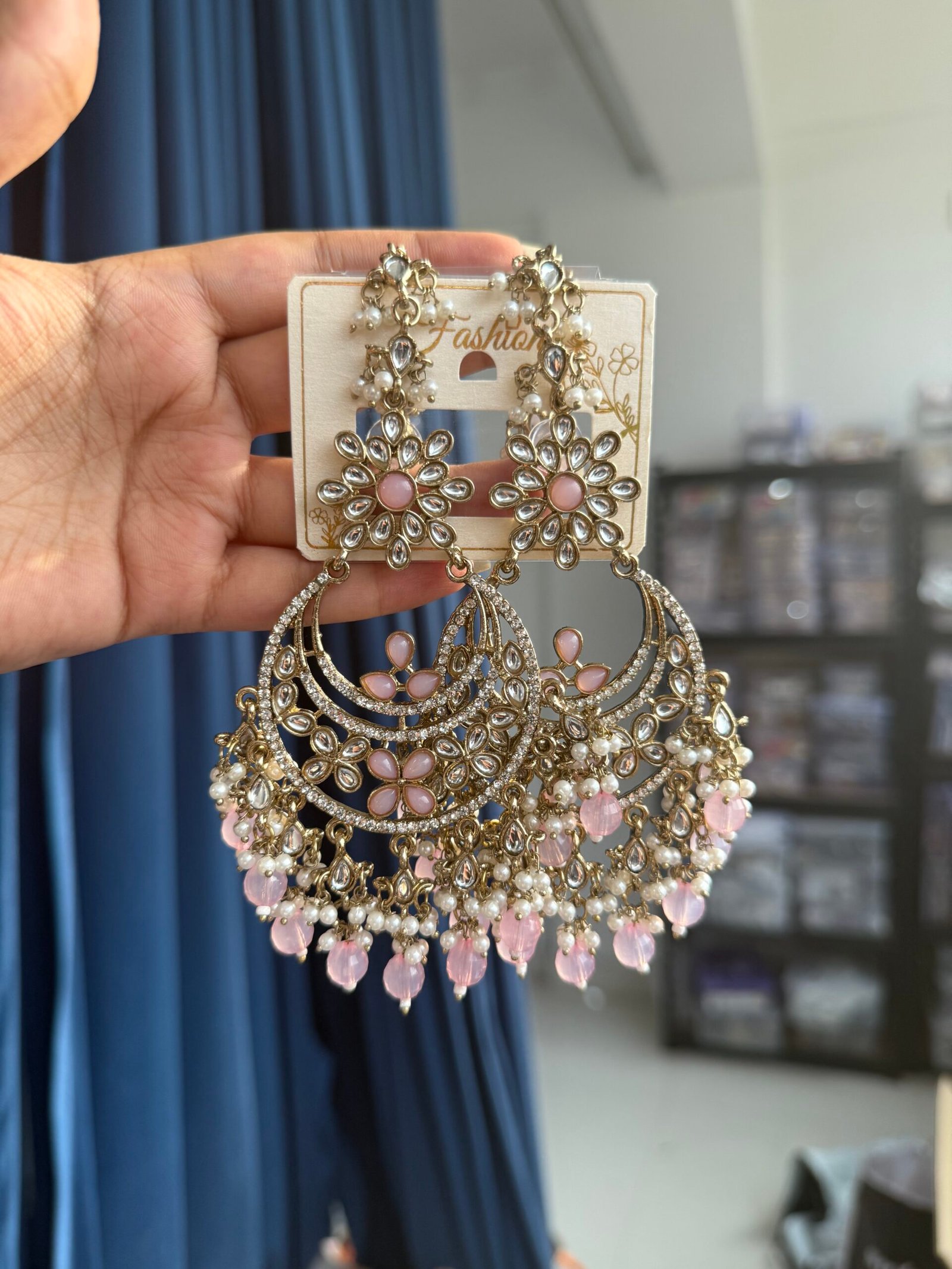 Meher Kundan Earrings With Kaan Chain – Light Pink