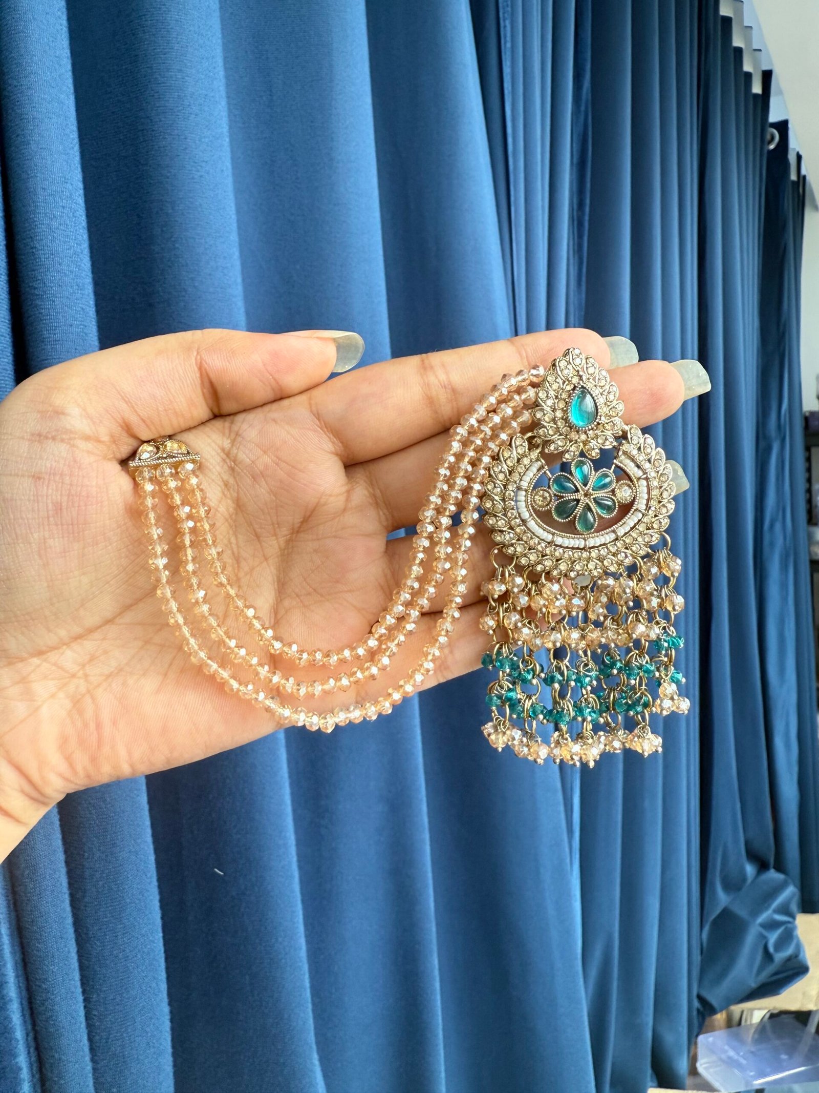 Be the first to review “Supriya Crystal Earrings With Kaan Chain – Teal Green”